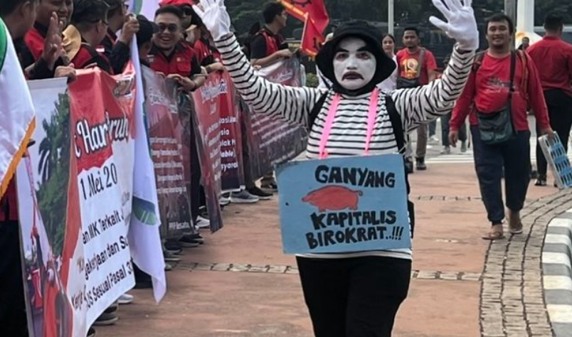 Beberapa di antara mereka juga ada yang memakai riasan pantomim dan mengalungkan papan bertuliskan ‘Ganyang Kapitalis Birokrat’. Pada saat yang sama, terlihat 20 personil polisi berjaga untuk mengawal jalannya demonstrasi. Saat ini, jalan menuju Gedung MK dari patung kuda tersebut sudah disterilisasi dari kendaraan.